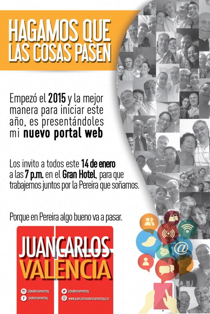 Para este miércoles 14 de enero está organizado el lanzamiento de la página web de la campaña del Pre candidato a la alcaldía de Pereira Juan Carlos Valencia Montoya el cual lo realiza a las 7 de la noche en el Gran Hotel.